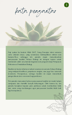Puji syukur ke hadirat Allah SWT, Sang Pencipta alam semesta serta seluruh isinya, yang senantiasa melimpahkan rahmat dan karunia-Nya, sehingga tim penulis dapat menyelesaikan penyusunan booklet Kebun Biologi ini dengan tujuan untuk memenuhi salah satu bentuk kegiatan dari program kerja Himpunan Mahasiswa Pendidikan Biologi.