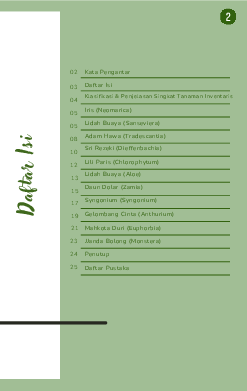 Booklet ini berisi informasi terkait tanaman inventaris Kebun Biologi yang meliputi klasifikasi, penjelasan singkat, dan juga foto tanaman inventaris. Harapannya, semoga booklet ini dapat menambah pengetahuan dan wawasan bagi pembaca.